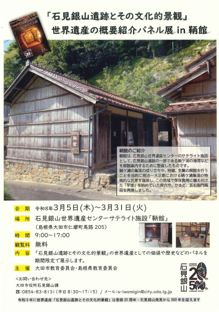 世界遺産「石見銀山遺跡とその文化的景観」の価値や歴史をわかりやすく解説するパネル展が、仁摩町のサテライト施設「鞆館(ともかん)」で開催されます。