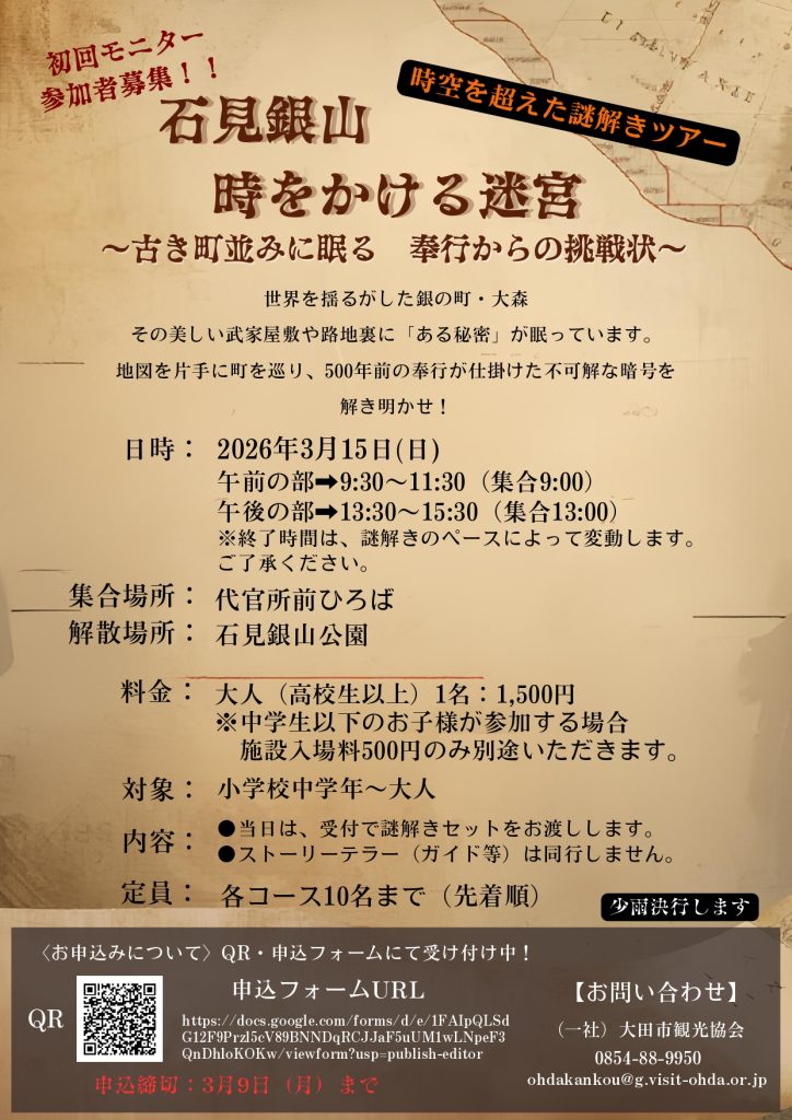 【初回モニター募集】石見銀山 時空を超えた謎解きツアー「時をかける迷宮」開催!(3/15)