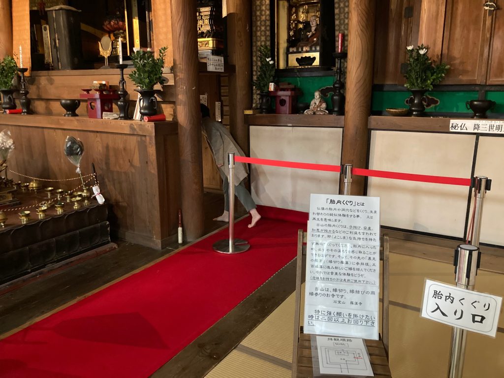 創設当時より、本尊さんの下を仏の胎内と見立てて空間にしてあります。仏の胎内を潜ることは、生まれ変わりの疑似体験をすること、または再生を意味します。当山の胎内くぐりは、身体の健全、子授け、安産、智恵が授かるなどのご利益があるとされ、そしてその先の「縁切り羅漢」(裏見の羅漢)を通り最後に五百羅漢にて新しいご縁を結びます。羅漢寺・五百羅漢は縁切り、縁結びの両縁参りの寺になっおり、まずは羅漢寺から参拝するのがおすすめです。